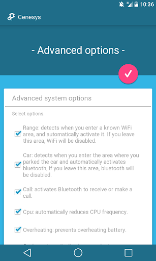 Cenesys has options that will manage your battery consumption, in an efficient way, while all of your phone potential it's going to be released, acting smartly, depending on the situation. You can control everything, and set up your app, with only some clicks.
